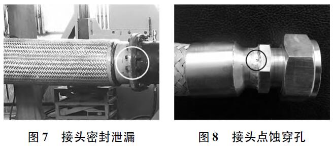 接頭的作用是將網(wǎng)套與波紋管聯(lián)接為一體,同時,接頭又是金屬軟管與金屬軟管或其他管件、設(shè)備相聯(lián)接的部件。它保證介質(zhì)在管路系統(tǒng)中正常工作。常見的失效模式有密封泄漏、點蝕穿孔等形式,見圖7、圖8。