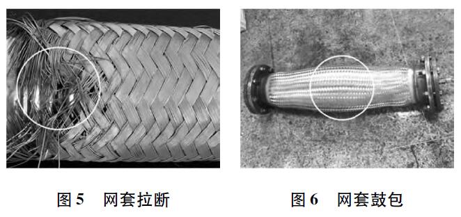 網(wǎng)套是由相互交叉的若干股金屬絲或若干條金屬帶按一定順序編織而成的,起著加強和屏蔽的作用。常見的失效模式有鋼絲、鋼帶、絲帶的拉斷及網(wǎng)套鼓包等形式,見圖5、圖6。