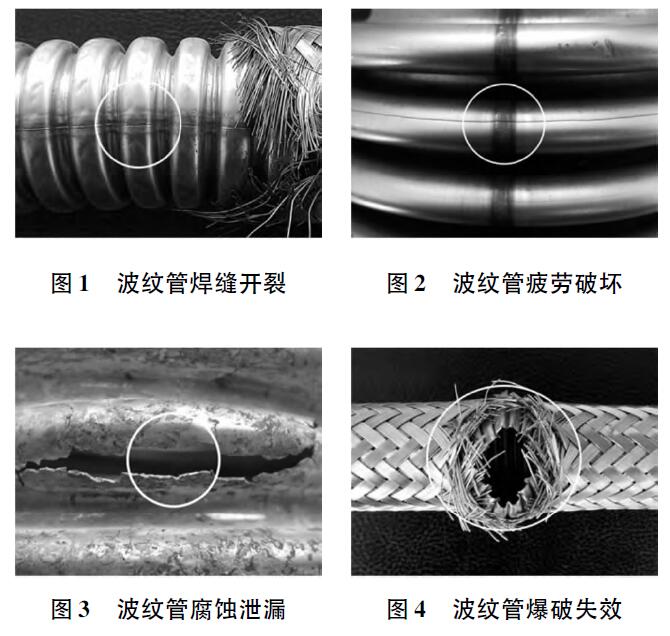 蛇皮穿線管主要由波紋管、金屬編織網(wǎng)套和接頭3部分組成。波紋管是蛇皮穿線管的本體,起著撓性的作用。常見的失效模式有焊縫開裂、疲勞破壞、腐蝕泄漏、爆破失效等形式,見圖1 ~ 圖4。