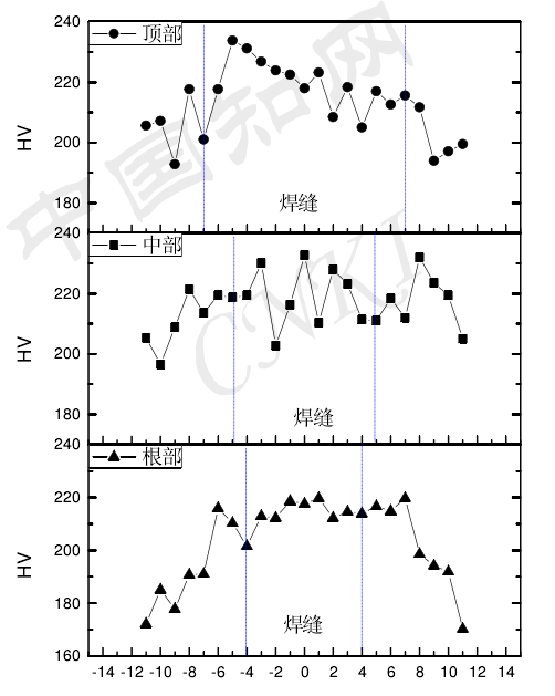 4.2.1 316L 的硬度分布圖 4-1 是 316L 焊縫頂部、中部和根部從母材到焊縫中心處的硬度分布。由圖可見(jiàn),從焊縫頂部到根部整個(gè)材料中,焊縫的硬度是最高,其最大值可達(dá) 229HV;母材是最低,其最小值可低到 175HV,而且熔合線附近母材硬度和基體母材硬度相差無(wú)幾,很難分別其高低。相同的焊接接頭硬度變化規(guī)律是因?yàn)橄鄳?yīng)部分的材料相同且組織分布一樣均勻。