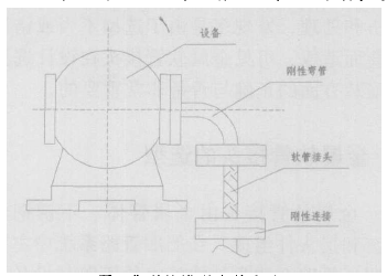 在這種安裝形式中, 由于設(shè)備的振動方向主要為上下垂直振動, 因此, 該金屬穿線軟管主要補償?shù)氖瞧漭S向的位移, 我們知道金屬穿線軟管本身在自然狀態(tài)下不能補償軸向位移, 這樣的安裝使用結(jié)果就必然是金屬穿線軟管無法承受強烈的軸向拉伸而產(chǎn)生斷裂, 從而導(dǎo)致管路泄漏。正確的安裝安裝方式見圖4 、圖5。